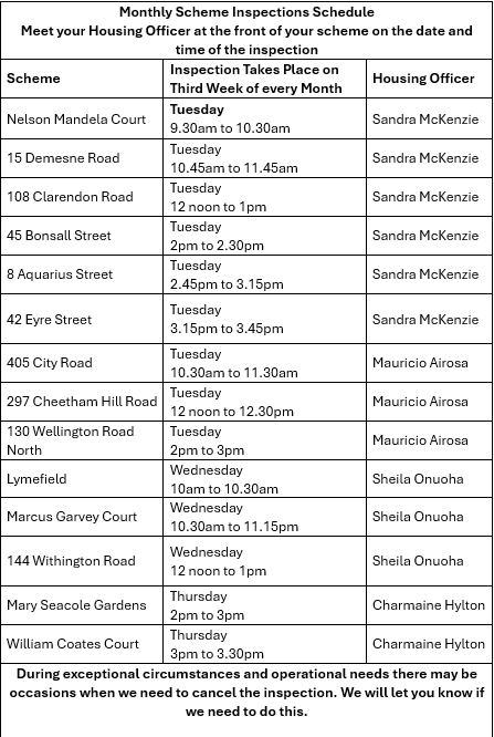 - Scheme inspections are for reviewing our outdoor and communal areas. If you have issues in your home you want to report, please get in touch with us, speak to your Housing Officer or we can pick them up in your next home visit.